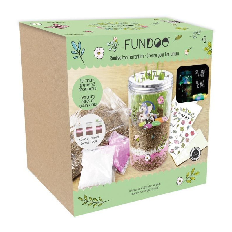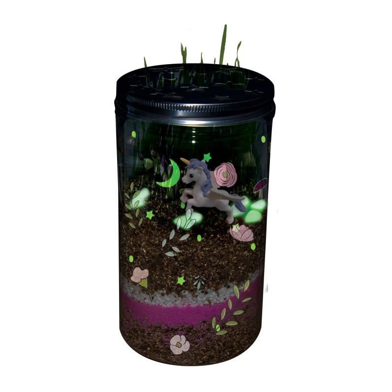 Cette boite ontient 1 jarre, 1 sachet de gravier, 1 sachet de sable coloré, 2 sachets de graines, 1 licorne, 1 planche d'autocollants, 1 planche d'autocollants phosphorescents, 1 spray, 1 sachet de vermiculite