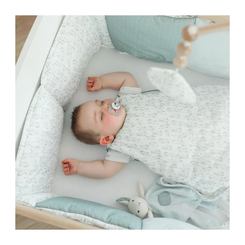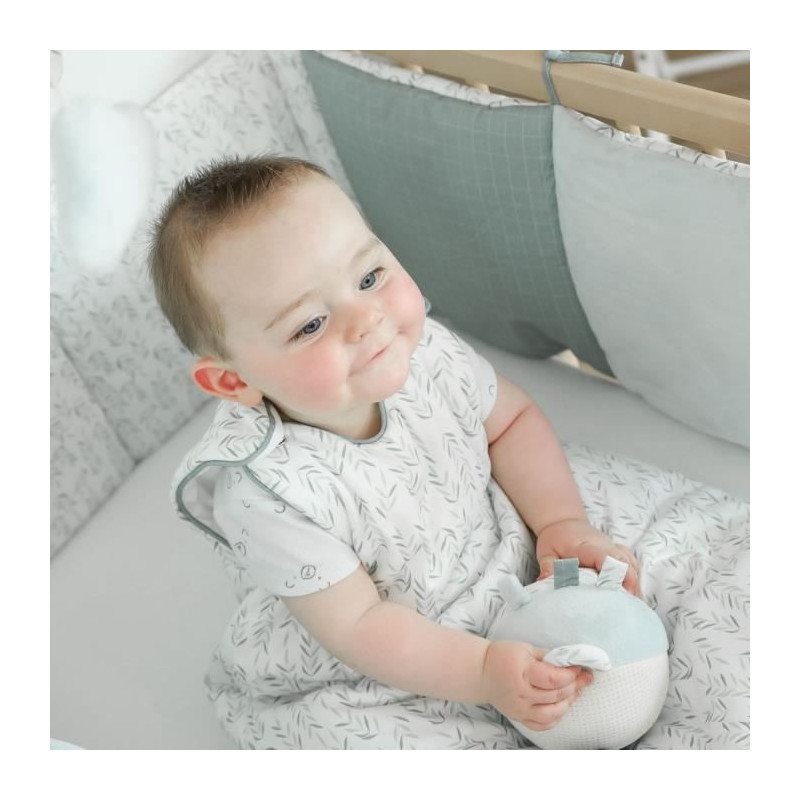 Un imprimé feuillage melé a un subtil carreau sur fond vert thym , on craque pour son personnage aux grandes oreilles, kangourou ? lapin ? souris ? Un theme tendance et authentique avec son personnage conçu dans une matiere effet « crochet» qui séduira petits et grands