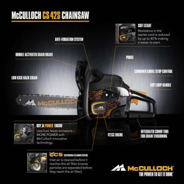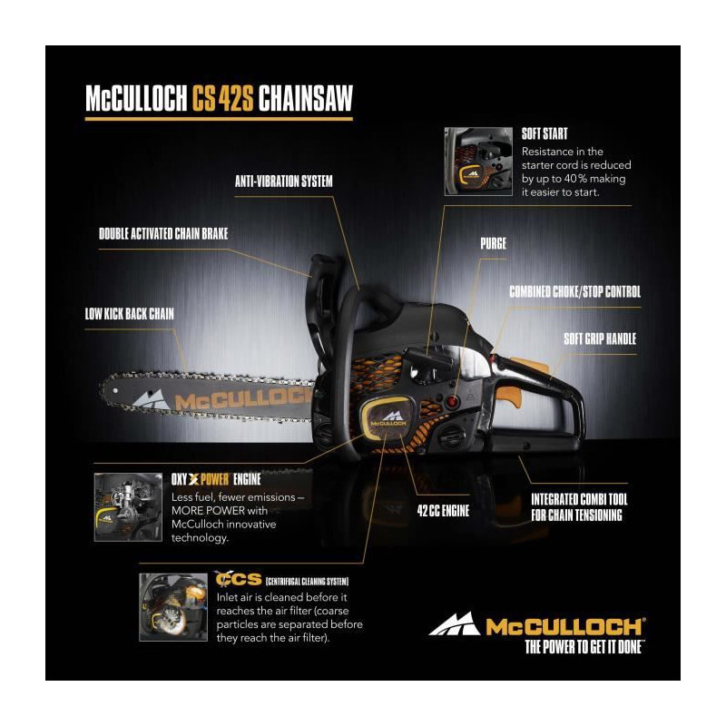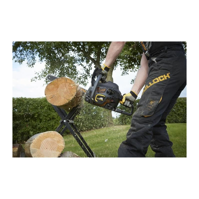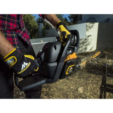 Tronçonneuse thermique - Guide / chaîne : 40 cm - 3/8" - 1,3 mm - 56 maillons - Vilebrequin complet - Vitesse de chaîne : 20 m/s - Lubrification automatique de la chaîne - 4,9 kg - Frein de chaîne a double activation - Systeme de filtration de l'air CCS - Commandes Starter / Stop combinées - Systeme anti-vibration performant