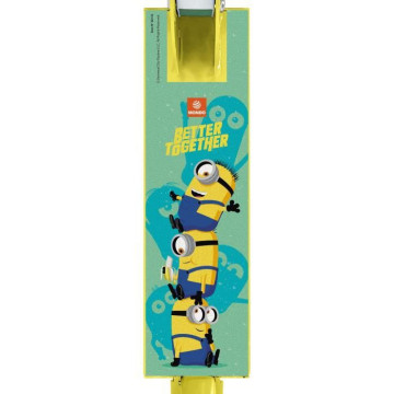 Trottinette 2 roues Minions (Moi, moche et méchant). Deck aluminium antidérapant, roues PVC 12cm, roulements ABEC-5, guidon réglable, pliage rapide, 50kg maximum. Des 5 ans.