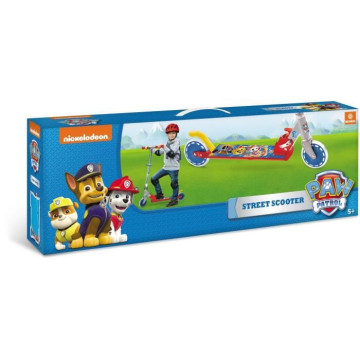 Trottinette 2 roues Pat'Patrouille. Deck aluminium antidérapant, roues PVC 12cm, roulements ABEC-5, guidon réglable, pliage rapide, 50kg maximum. Des 5 ans.