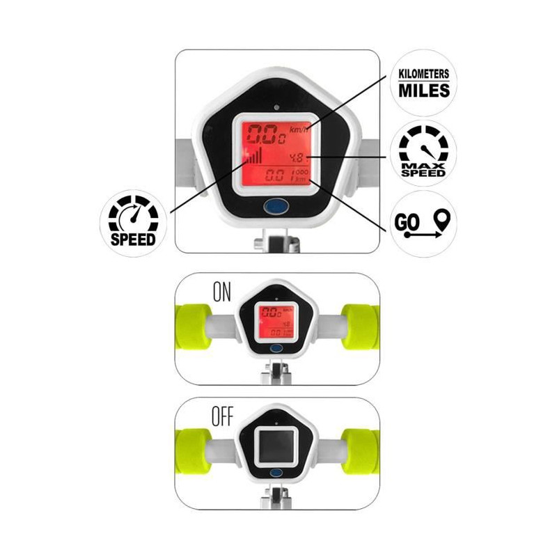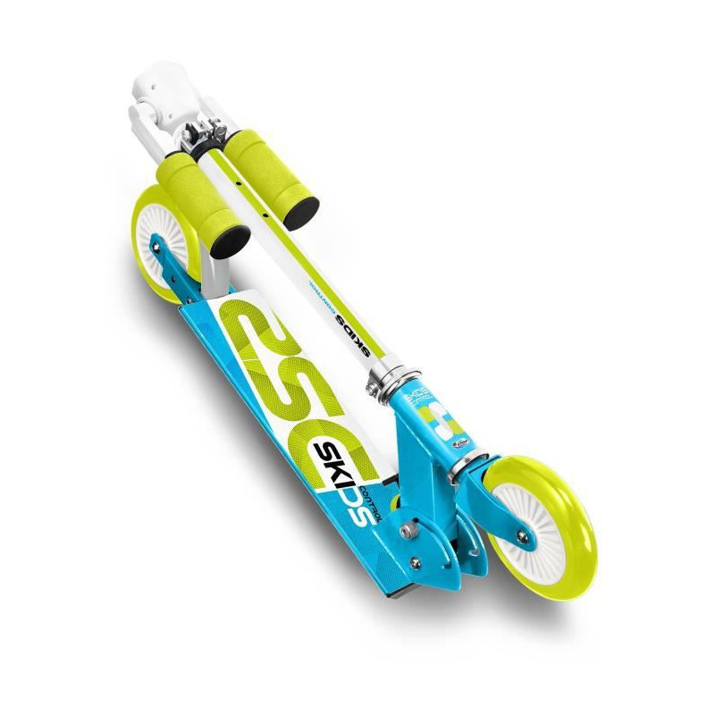 Trottinette pliable Skids Control - Avec compteur de vitesse - Rétroéclairage - Roulement a billes en ABEC 5 - Frein arriere au pied - Hauteur ajustable - Plateau en aluminium antidérapant - Poignées en mousse - Coloris : bleu, vert fluo, blanc et noir - Garçon - a partir de 5 ans - Livré a l'unité.