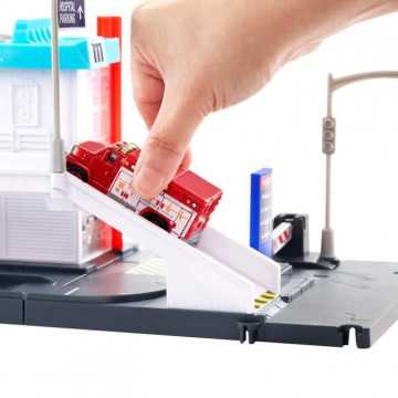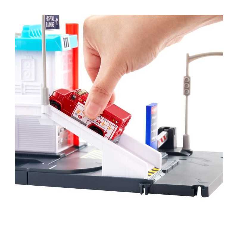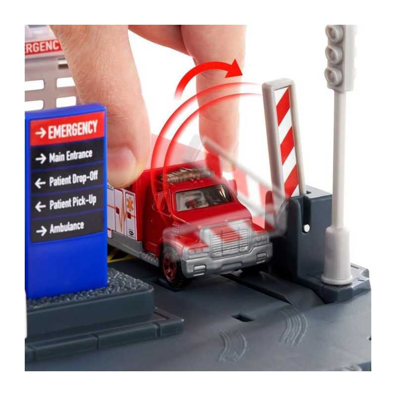 Ce playset Matchbox Hôpital propose des aventures réalistes aux enfants dans un hôpital équipé d'un systeme d'évacuation médicale par hélicoptere et de fonctionnalités déclenchées par la voiture. Faites avancer l'ambulance a l'échelle 1/64 pour ouvrir la barriere d'urgence ! Un hélicoptere en plastique avec une hélice a rotation libre et un parking sont également inclus dans ce playset.