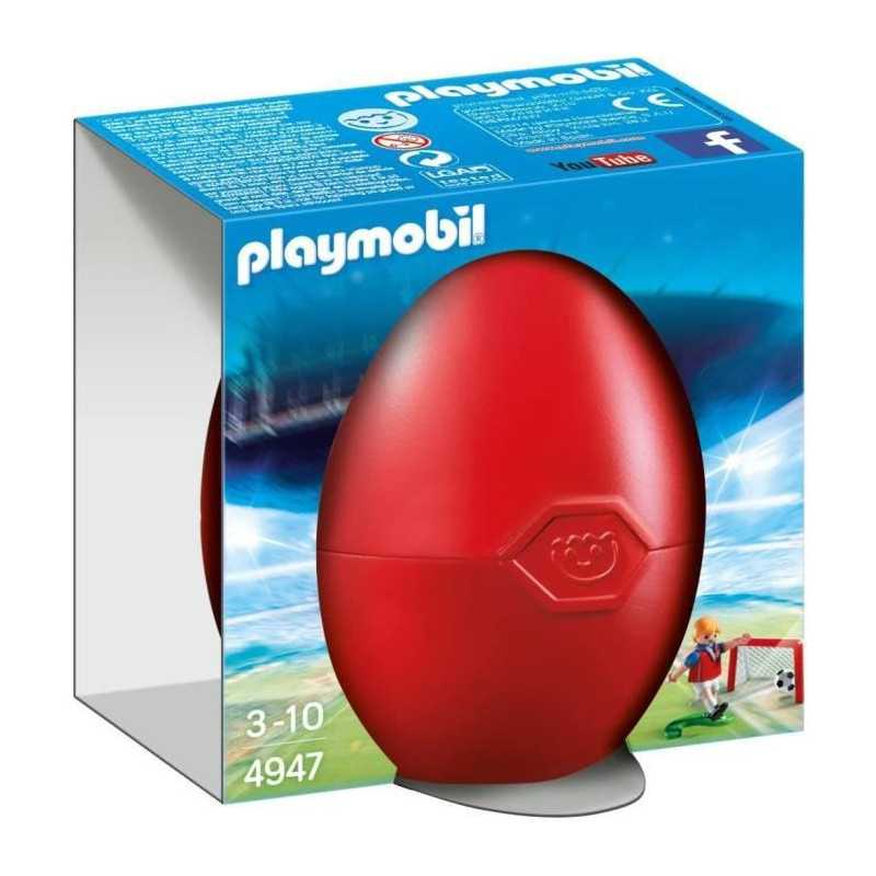 Les oeufs de Pâques PLAYMOBIL !... Dans chaque oeuf : une figurine et ses accessoires. Le joueur est pret pour la séance de tirs au but, il s'élance et il marque !