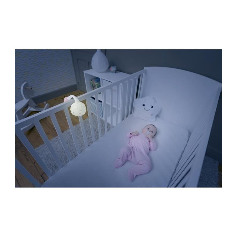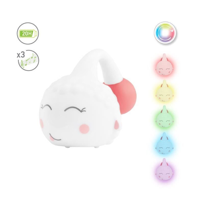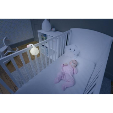 - Lumieres douces (rose, mauve, bleue et verte) - Fonctionnement en lumiere fixe ou arc en ciel - Musique : 3 berceuses, arret automatique 30m - Musique et lumieres indépendantes - Astucieuse : elle s'accroche aux barreaux du lit - Évolutive et nomade - Autonomie jusqu'a 20h - Rechargeable via câble USB (fourni).