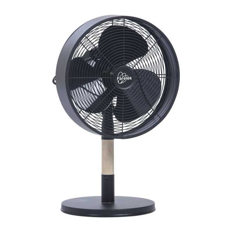 Ventilateur a poser diametre 30cm, puissance 35W, 3 vitesses, oscillant +/- 90°, inclinaison réglable, socle métallique noir avec protection anti-rayures, pied en bois (certifié FSC) colori pin clair/naturel, 3 pales plastique noires, grille de protection métallique noire avec poignée de transport ou d'enroulage du cordon électrique, bloc moteur en métal noir avec bouton de blocage / déblocage de la fonction oscillan