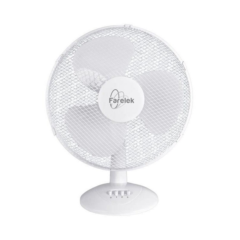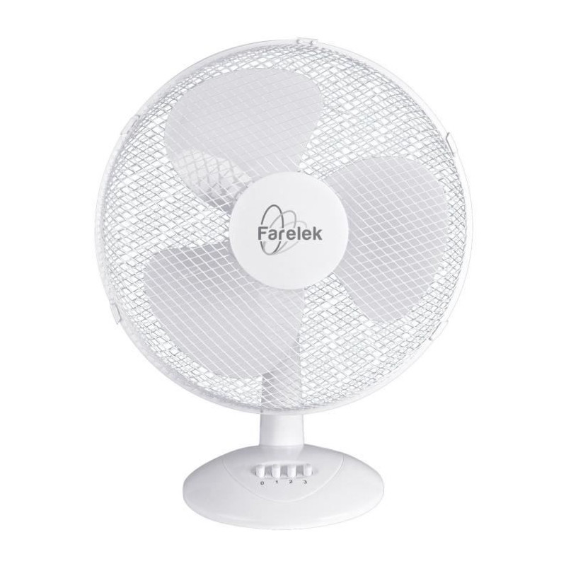 Ventilateur a poser diametre 40cm, puissance 50W, 3 vitesses, oscillant +/- 90°, inclinaison réglable, pied plastique blanc, 3 pales plastique blanches, grille de protection métallique blanche avec poignée de transport ou d'enroulage du cordon électrique, bloc moteur plastique blanc avec bouton de blocage / déblocage de la fonction oscillante a l'arriere. Grille de protection démontable pour nettoyage facile des pale