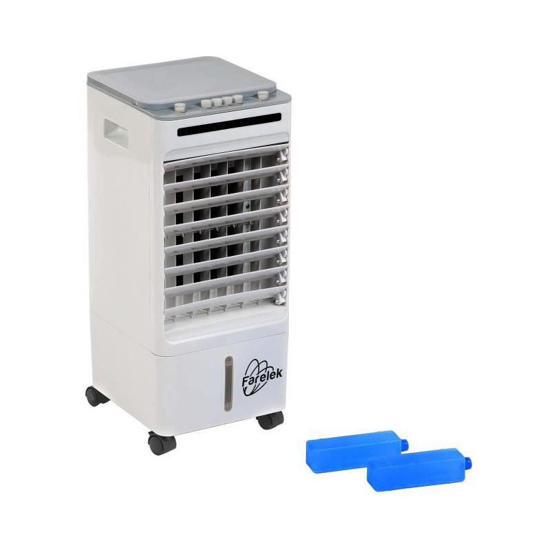 Rafraîchisseur d'air 65W, réservoir 6L a remplissage par le haut, indicateur de niveau d'eau a l'avant, grille oscillante +/-30° pour une bonne diffusion de la fraîcheur, 2 poignées de transport et 4 roulettes multi-directionnelles pour déplacer facilement le rafraîchisseur d'une piece a l'autre, 2 bouteille a congeler pour accentuer la rafraîchissement lors de fortes chaleurs, grille d'entrée d'air amovible et lavab