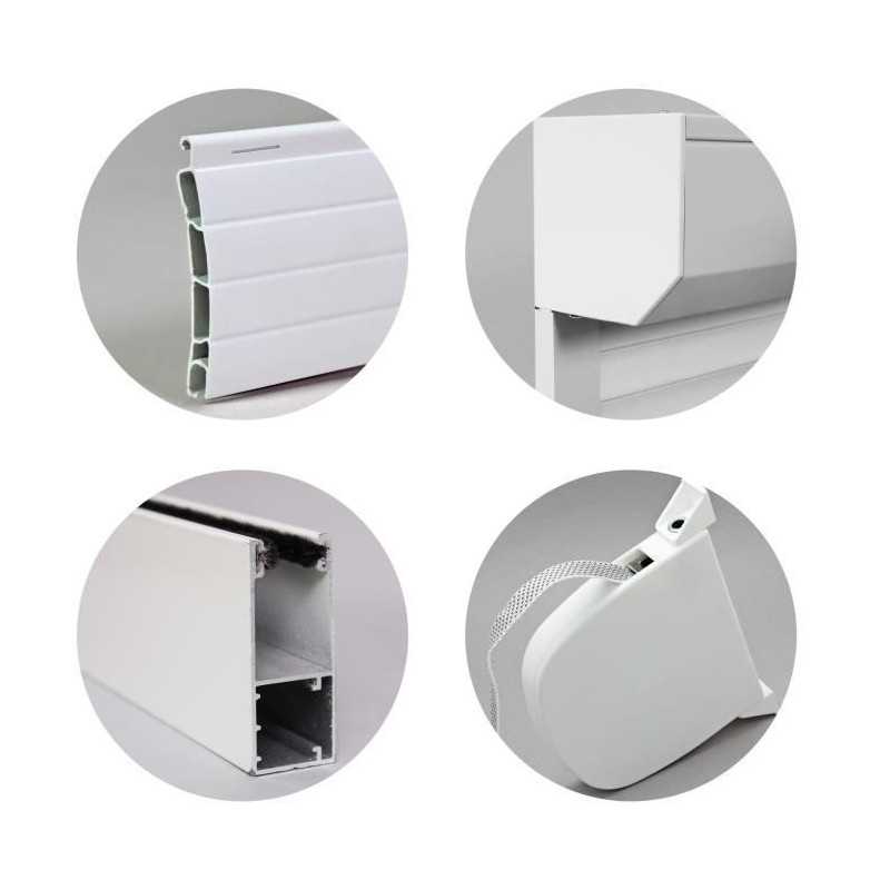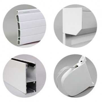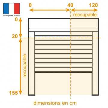 Volet roulant recoupable - Avec enrouleur de sangle - Lames PVC double paroi - Adaptable a la plupart des fenetres et porte-fenetres - Poses possibles : En tableau avec enroulement intérieur ou extérieur / En applique - Sortie de manoeuvre droite ou gauche - Coffre pan coupé a faible encombrement - Dimensions : 120x155 cm.
